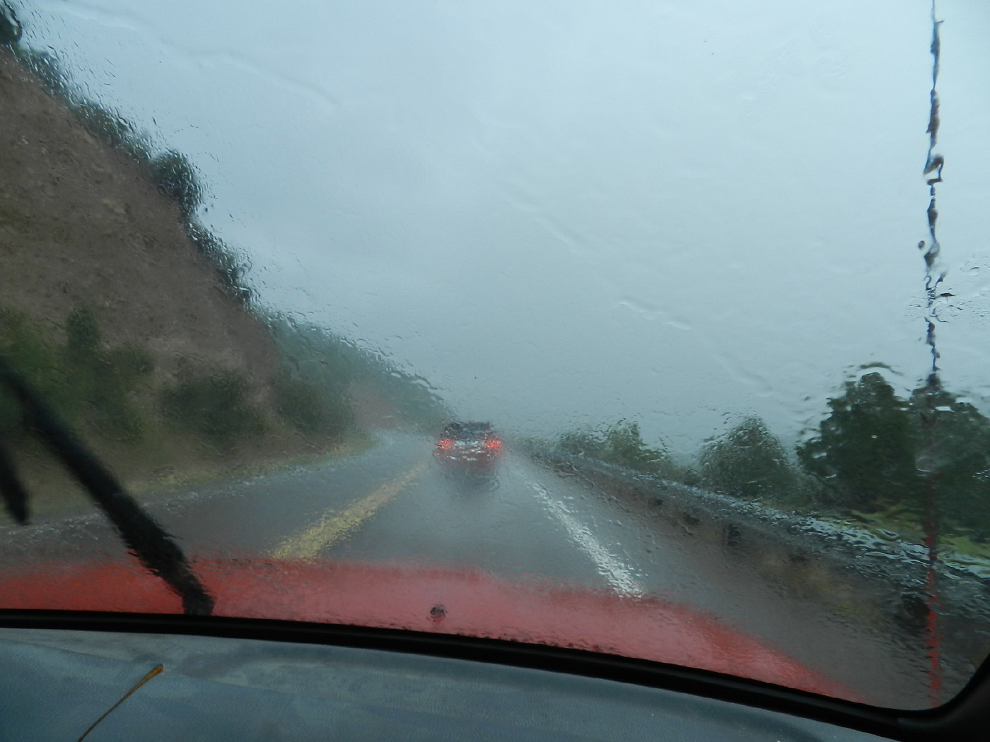 Continuing on this winding steep road, climbing and descending through rugged slopes, we are soon engulfed in thick torrential rain. At some points, others are pulled off of the side of the road. The wipers are turned from slow to fast and back again as the visibility through our windows changes. I am leaning up in my seat, alert, watching for falling rocks on the road. Occasionally, I have to drive around a pile of the debris.