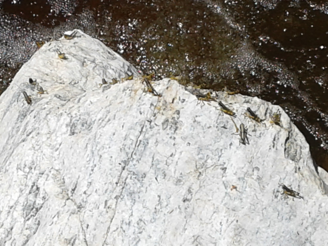 I make my way back, tiny frogs scamper up rock surfaces. Half a hundred grasshoppers jump at once in some places, after each step.