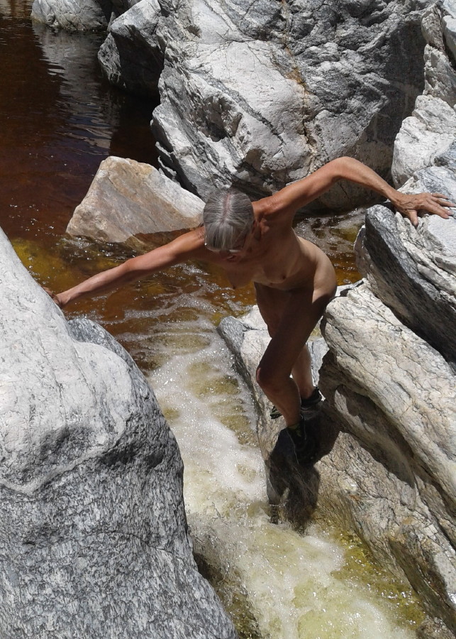 There is a comradery among the people who come here naked. On many days, including this one, the drinking and loud music crowd in the lower falls is outnumbered by the nudes up here. Every one of these naked people values this place. They care for it and clean it. Many have become friends. It is friendly, liberating and peaceful. Many congregate at the beach area, but still others climb and hike deeper into the canyon in solitude. The trail was created by naturists decades ago. We own it.
