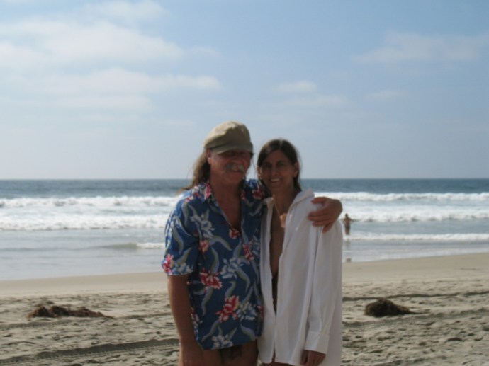 Towels become furniture, not covering, as soon as we are among brethren on the nude beach and that is the way that it stays. There is some organization at Black’s Beach. A friendly fellow greets us and sets us up with an umbrella. They have some barbequed sausage that is being given away with a smile, but alas, we are both vegetarian and had to refuse the juicy temptation of the aroma.