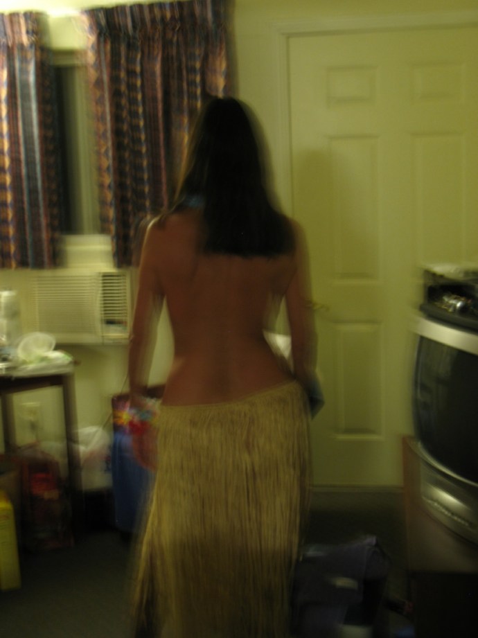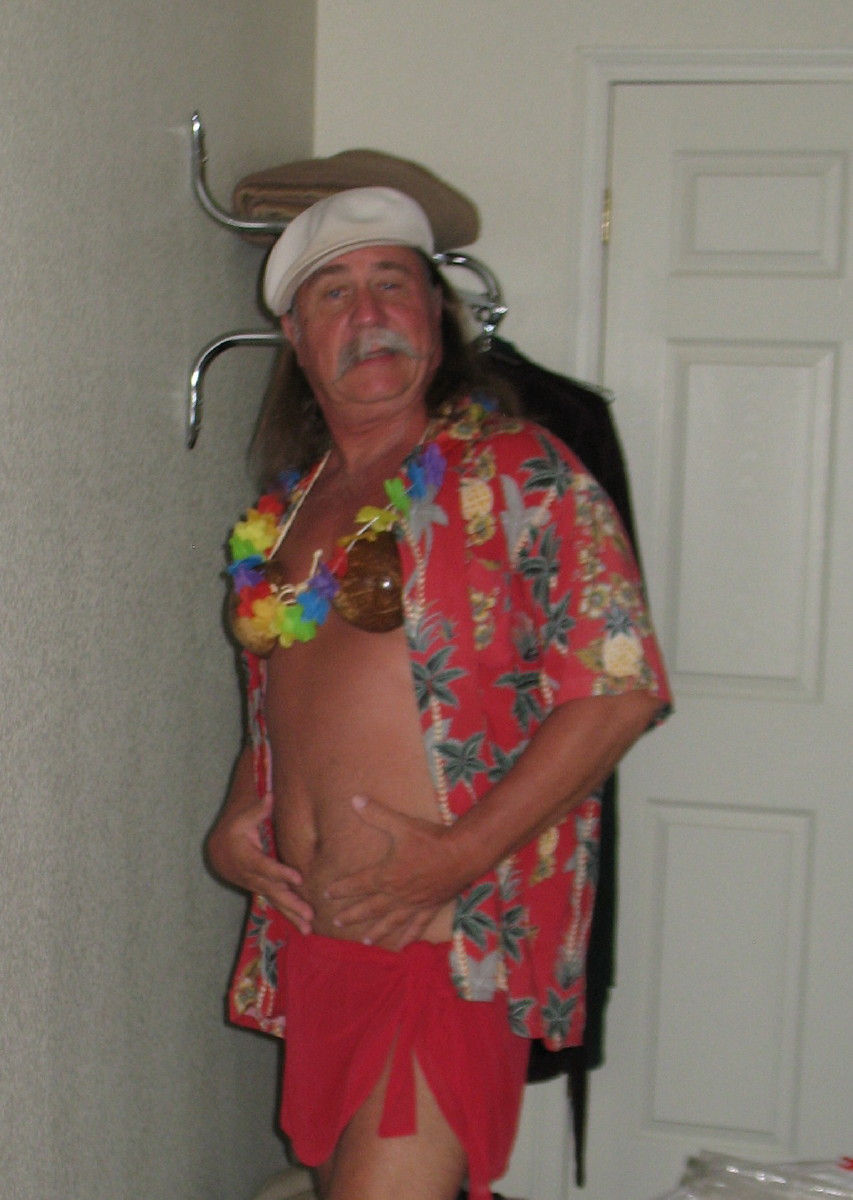 That evening, there is a themed party at the resort. A tropical theme has been chosen. We have known of this beforehand and have prepared for the festivities and their lax festive attitudes. DF has brought out her grass skirt, with its leggy high cut, which is on the leg where the grass doesn’t hang.