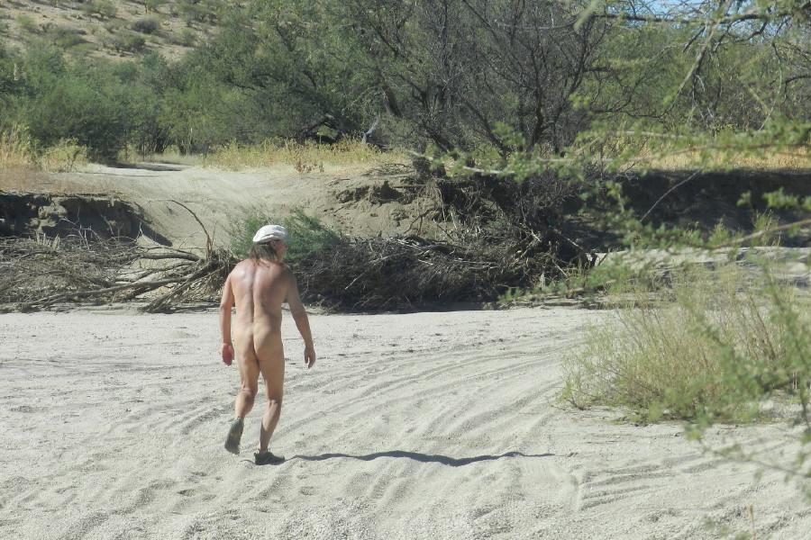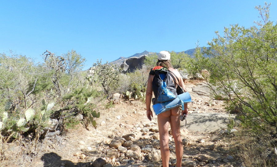 A mile in, we realize that we have most likely seen the last person of the day. There will be no encounters, no one to bother us, or greet in our nude state. There has been little to do to cover today. I just stood behind the door of my SUV, as I was already. DF didn’t need to cover her breasts at the parking lot. The synchronicity has left us as if in a more perfect world. The people around us don’t see our nudity, as if by magic. Now, we are free to roam naturally.