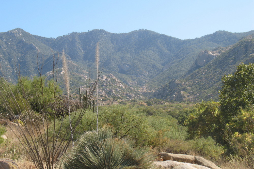 We see a grand peak in the distance. At its foot, there appears to be what looks like water sheeting on granite surfaces. We are in a drought. Everything is dry here. It is an illusion, the sun playing tricks. The succulent cacti are wrinkled. Leaves are yellowing and falling off the mesquite. The tall grass is brown and brittle. Any flowers are a dry bouquet. We have extra water in my pack, with our lunch.