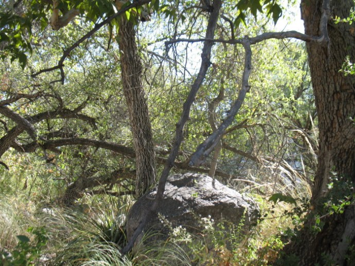 I spot some taller trees up ahead. There is dried creek, which is a catchment for all of the runoff of the mountain slopes. As we gaze up at the rugged terrain, DF mentions that she heard that the Big Horn Sheep are making a strong comeback from extinction in these rugged mountains.