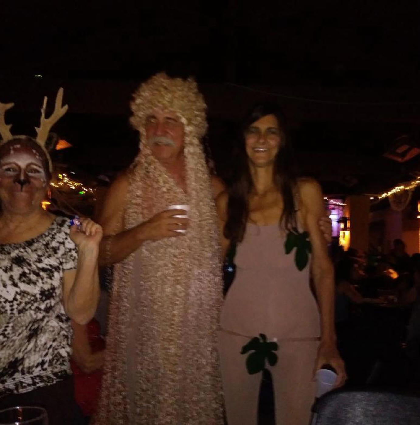 DF was still left with only a nude see-through body suit. I suggested fig leaves. Perhaps we could be Adam and Eve. All of the wigs that I found were too short. Ultimately, we found green felt and I copied a picture of a fig leaf. We attached the felt leaves to a transparent plastic belt. It now gives me the option to take the long hot wig off, if it gets itchy and become Eve’s Adam.