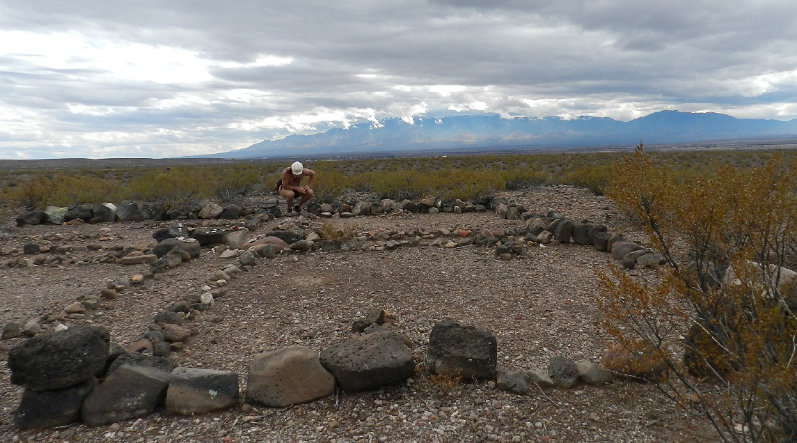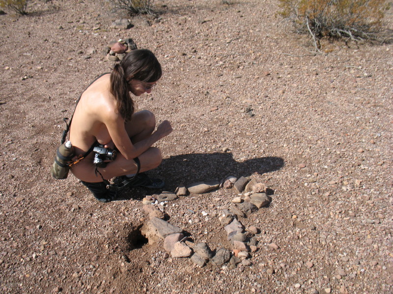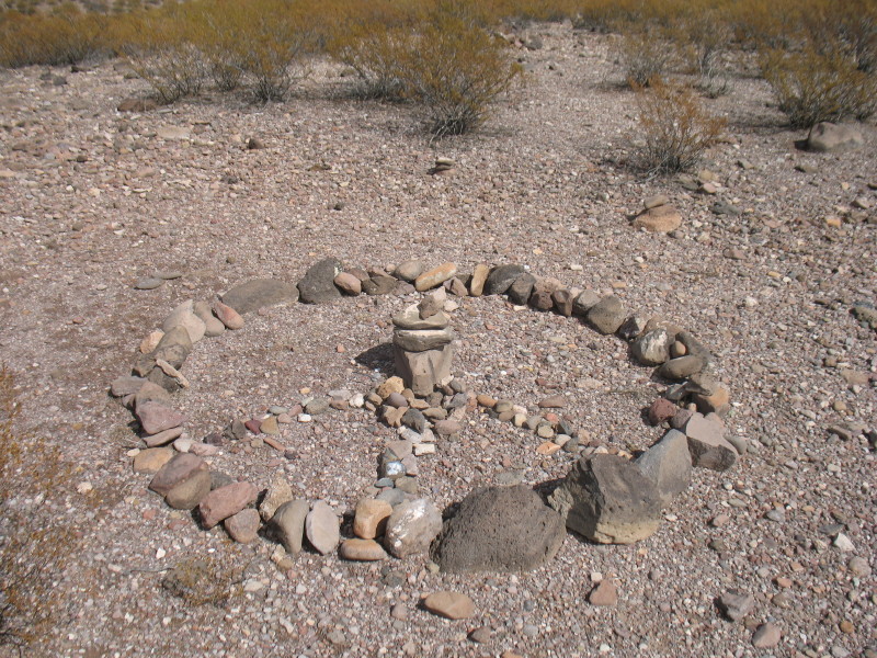 We climb a creosote covered ridge not expecting to see anything in particular, perhaps a vista, rocks and more creosote. There, we find two women, who are walking and looking down. Atop this hill people have been setting up monuments out of the rocks. Some appear to be just someone believing that they are improving nature, like a rock garden, or changing the décor, or making organized sense out of this chaotic world. Others are for worship. Circles, mazes, cairns are with favored rocks of all colors shapes and sizes. This is what some people, generally naked people, do on a Sunday morning.