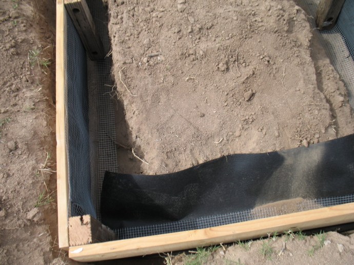 I dug deep and laid the mesh under a 2×8 frame, which I complicated with roofing paper. If I hadn’t, the rats, gofers and other diggers would find their way in. The roofing paper also helps keep the wood from rotting, as the old wood stays dry in the desert air. No roots were set near the paper.
