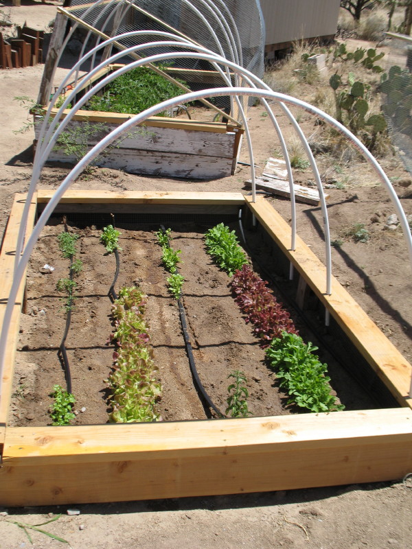 To protect the crop, I designed a raised bed with a PVC hoop roof made with bread cloth wire mesh. This keeps out the birds, packrats, lizards and javalina.