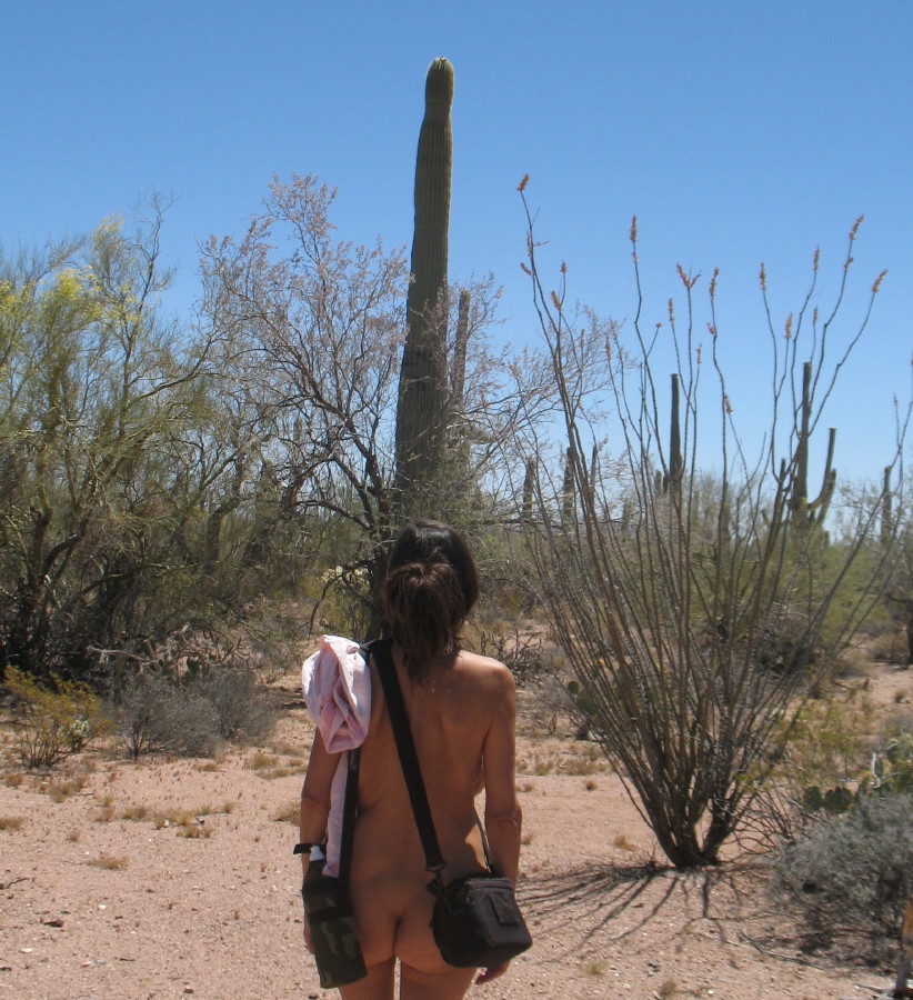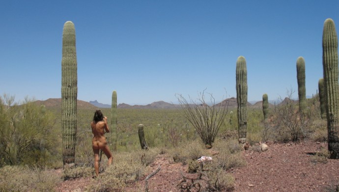 We find one of the giant cactus that is just slightly wider. This is the only convenient spot. Placing our dab of clothing on the ground, we manage to sit just so in some shade, keeping the burning sun from directly coating our skin. We are in tandem, like sitting on a motorcycle. There is a light breeze, which makes a significant difference in comfort. We mention how fortunate we are to have our skin exposed all over to be cooled and to appreciate the breeze. It is a blessing. We have a snack, some fruit and grapes. I have made dehydrated crackers from carrot pulp, chia seeds and tamari sauce. We laugh at our tiny accommodations sitting as if on a toboggan, as we imbibe the wide vista and listen to the quiet. A turtle dove slides by on air and we hear the patter beat of wings passing over, a bird calls out from a bush, one of us shifts a naked limb….
