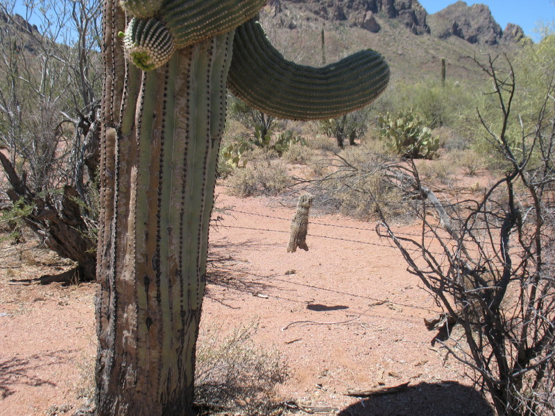 We have become tired and hungry. DF jokingly attempts to stand sideways in the shade of a tall saguaro.