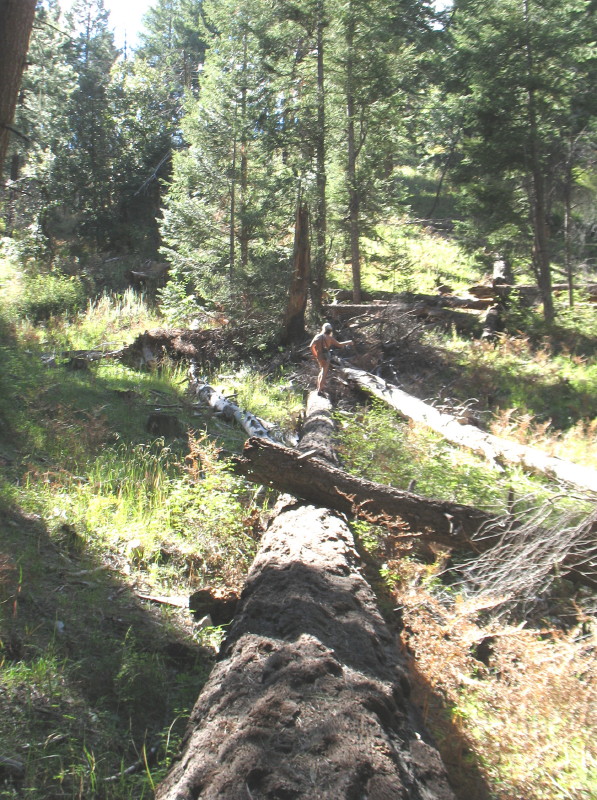 The winds, of course Murphy’s Law, pick up. In the pass, they sound much like approaching vehicles. If someone were to come around the corner quickly, there is nowhere to hide. We have to listen for the motors. She is hunkering down stealthful and in alert, looking both ways with the thing in hand, when she hears a truck coming! She drops her load and scurries back to squat behind a not big rock. It has been placed by the forest service to keep drivers from passing into the woods.