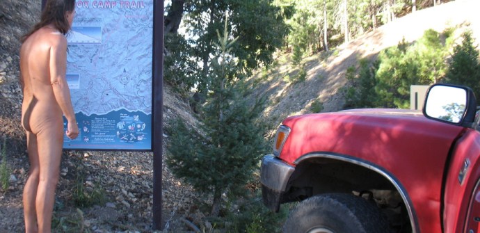 We have time. We decide to go for it, just to go. We discuss the possibility of being found nude by the one of two hikers that belong to the truck. We decide to, this time, just stay naked and act as though there was nothing unusual with our undress. We are sensing a bold liberation.