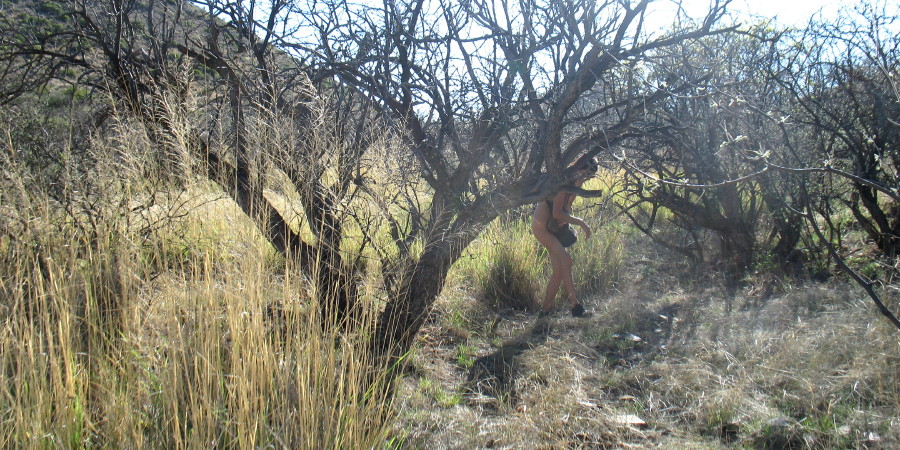 High up on a rise, in the distance, we see a glare, a sharp light. The sun is hitting a glass surface up there. I recall no road there. Could it be a border patrol watch point? Would they have a telescopic vision of us. Obviously, we are not illegals from Mexico. They don’t cross the border naked. We are far away, but can they know how we are dressed? I look at the difficult terrain between the light and us and think, “Oh well, come and find out.”