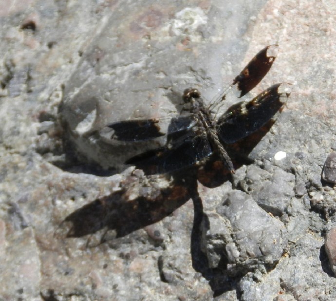 We soak and watch the unusual water bugs. One has racing stripe markings; the other seems patterned after a Gila Monster. Butterflies leave their shadows, as they travel. The rock that we sit on is a beautiful conglomerate specimen and a dragonfly decides to rest with us.