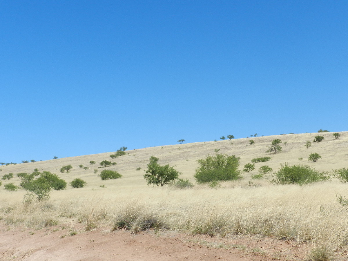 We drive through rolling hills of golden dry tall grasses, which look like wheat. Mesquite are green dots among the gold.