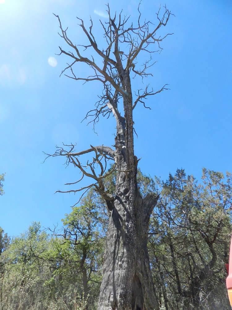 We come across an old hulk, a tree that has been damaged by fire. As it sits in grand character next to the trail, DF taps it, knocking and asking where the fairies are. It has a hollowed sound.