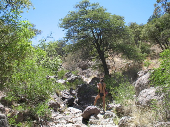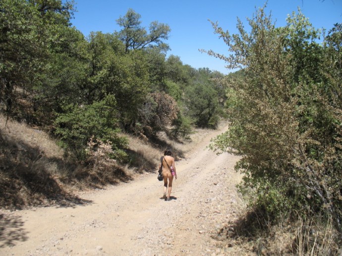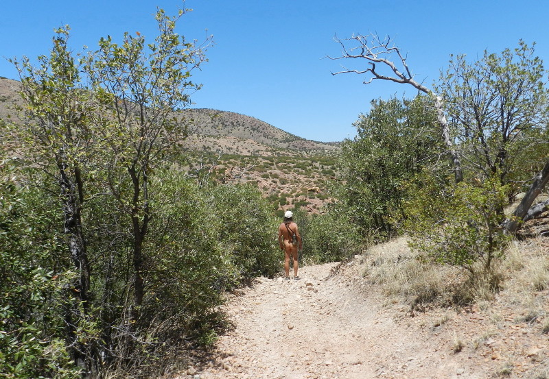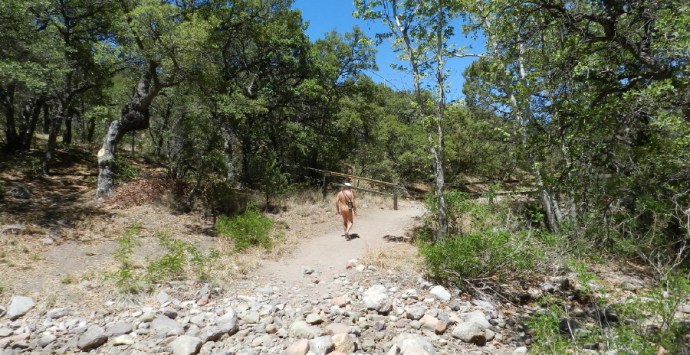 We had originally planned a trip up to the Wilderness of Rocks on Mt. Lemmon, but it would be only a high in the upper sixties and high winds at 8000 feet. This trip is a nudist’s backup plan. Here it is only seven to ten degrees cooler than Tucson’s 90F degree heat. The mid-eighties temperature with this breeze is panning out to be a great choice.