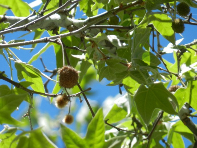 Something falls from a tree into the dried leaves next to us, clunk. We look up, but can’t figure it out. There are seed balls up there. Perhaps it was one of those falling off.