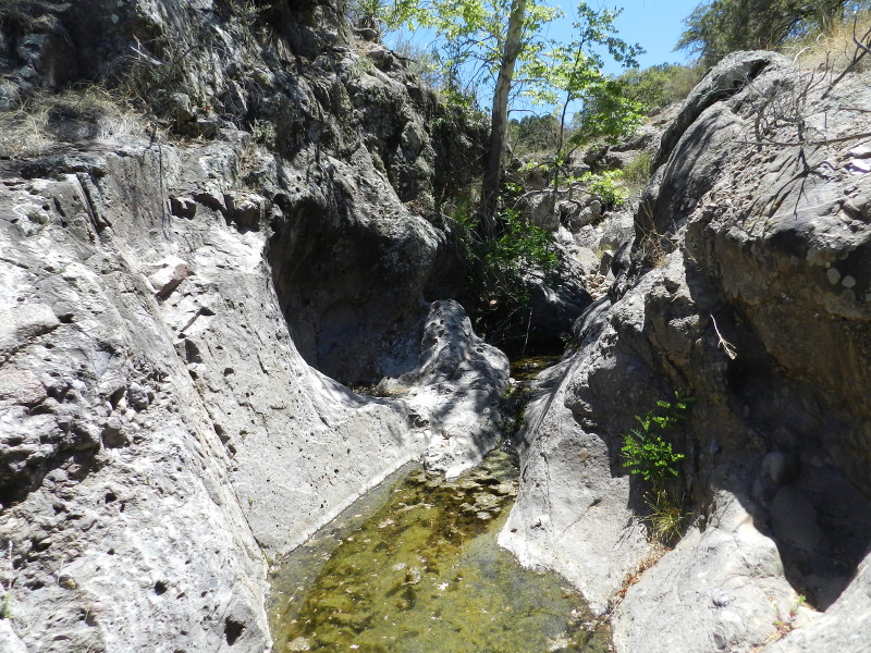 DF notices a pool of water in a rock gully below.