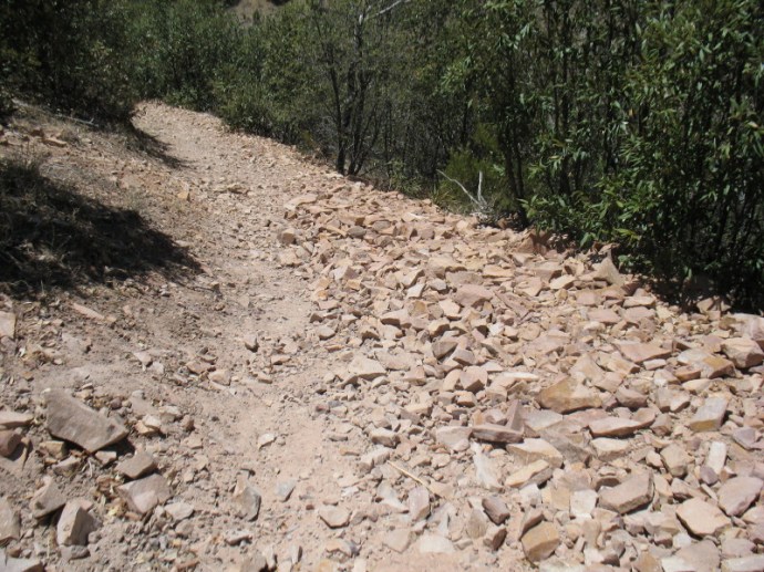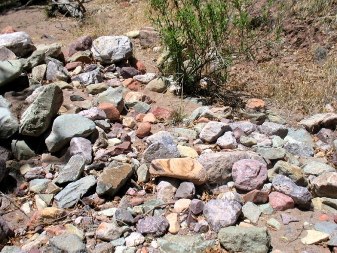 We cut back and forth into the little canyon below, listening to the wind and the birds. It levels out into a wooded creek bed. There has been much erosion here during a heavy flood, perhaps washout after the fire’s destruction. There is river rock exposed everywhere. Every color is represented, but greens.