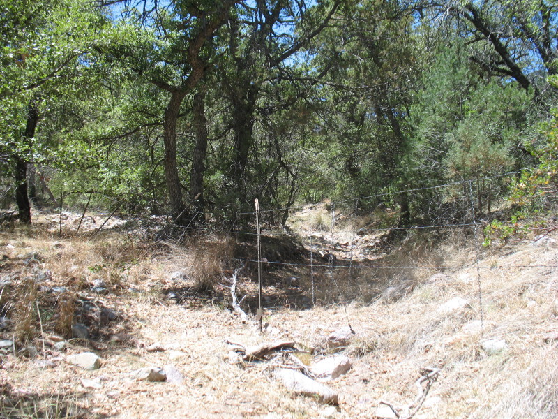I walk up the creek hopping from one large rock to another and find a fence.
