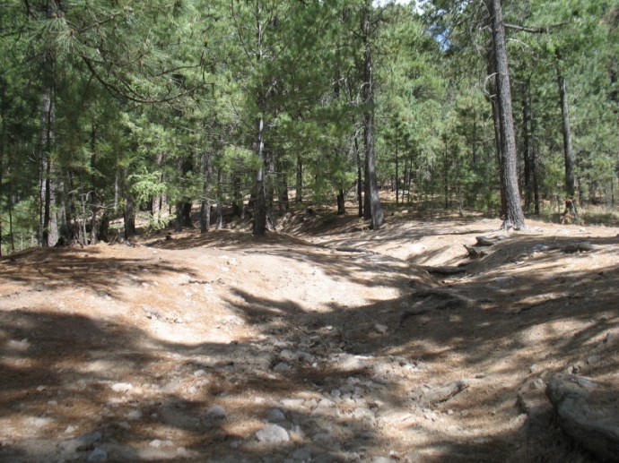 I climb through some thicker vegetation and into a pine needle litter area. The acid from the pines keeps other vegetation away. Where it is thick it is slippery, where the debris is thin there is erosion. The activity of campers has kicked the mulch of it to the side in places. The effect is more barren and I am exposed.