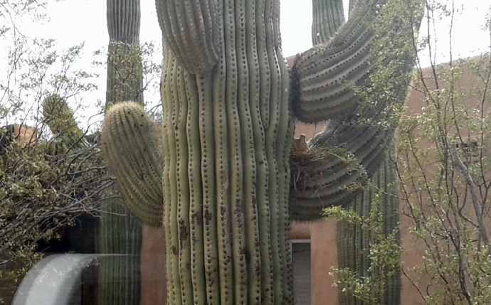 Out the full length window, a vigilant turtledove is sitting on eggs in the arm of a saguaro. It sits quietly and stares. We speculate if it is staring at us inside, or its own refection that appeared with the afternoon sun.