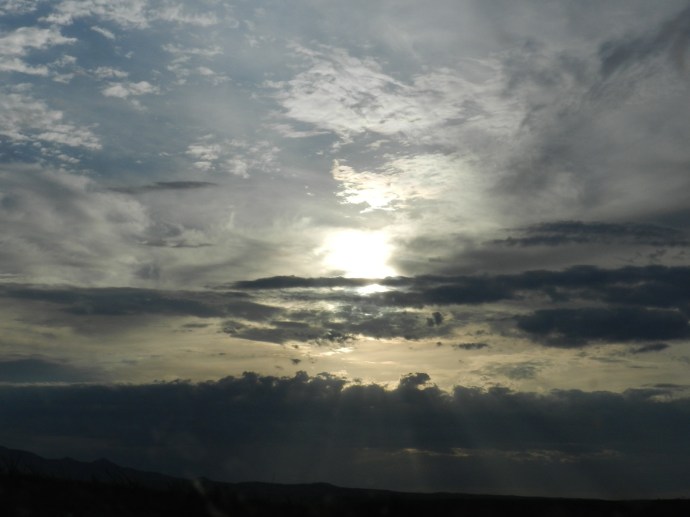 We are hidden from the empty road. I look out, watching the heavily clouded sky, as it is breaking up into a plethora of cloud shapes at various heights. They float in clear blue skies. Now that it is cleared from the rain, the air smells pure. A few birds call to each other. It is pleasant.