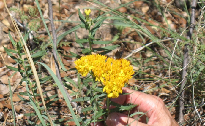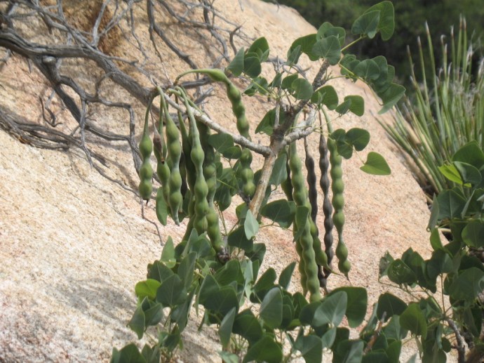 DF finds a plant dripping with huge bean pods. She recognizes them and is thrilled. They are something that she discovered back in 1973 and has been fascinated to see them ever since in different locales and seasons. She takes several photos of the beans.