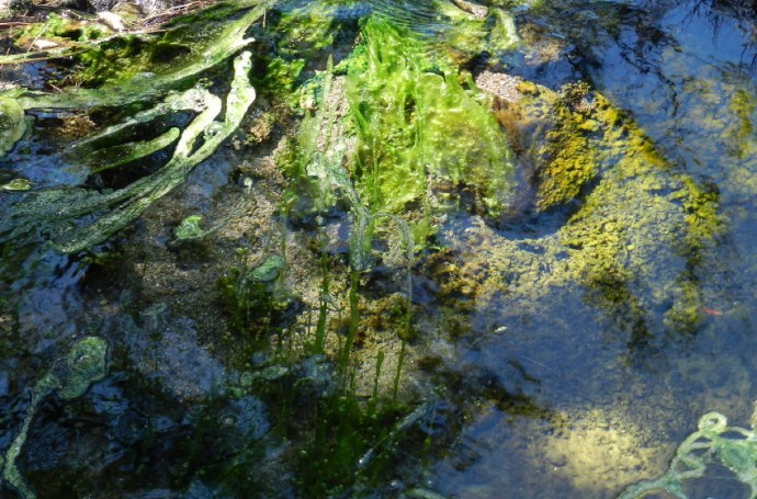 We squat down for a closer observation. Strings of green slime float, anchored to the bottom. Bubbles accumulate and slowly work their way up stalks as they sway like seaweed. Some pop out into the fresh air. Shadows dance. It is beautiful. DF tries to capture some of it in a frame. We both agree that it needs a movie.