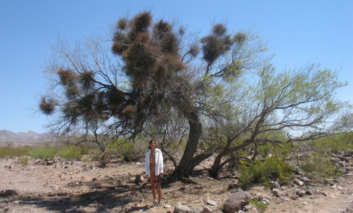 We continue on, our next goal in the distance is a taller mesquite that appears to have been completely engulfed in mistletoe. Mistletoe here is a rude desert parasitic growth. This tree has survived a harsh dry life. It has been weakened by these conditions. Again, we walk along as if on a beach, searching for the more solid meander formed by dissipating water flow.