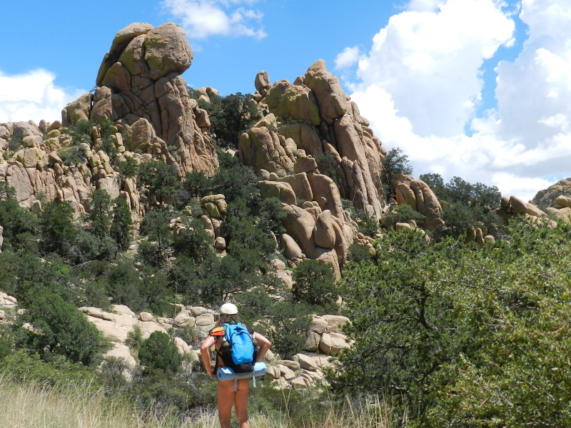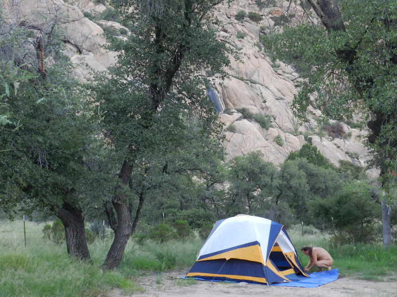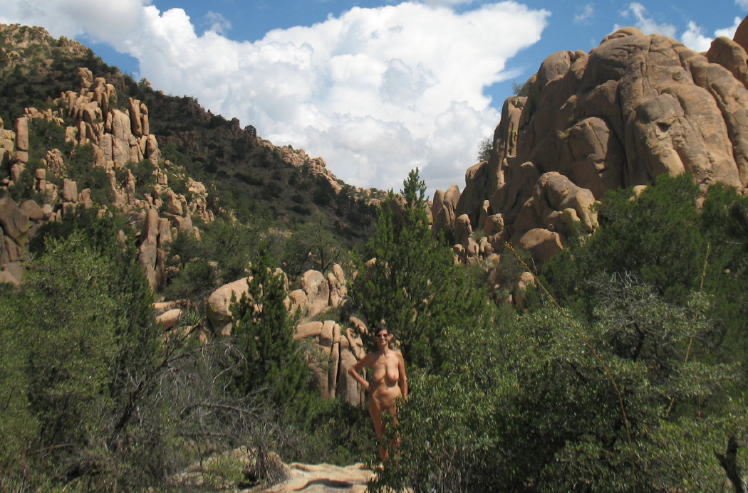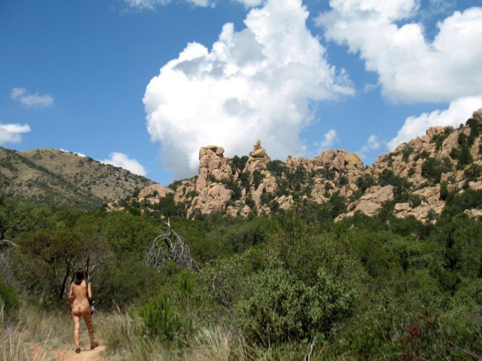 The other factor is that we are in a monsoon. Sometimes overcast will drop the temperature, or clouds will give frequent shade. The elevation starts around 5000 feet, which makes it about ten degrees Fahrenheit cooler than Tucson. The forecast was partly sunny and low 80F’s, perfect for a nude body to roam.