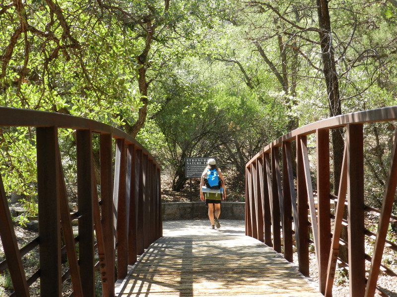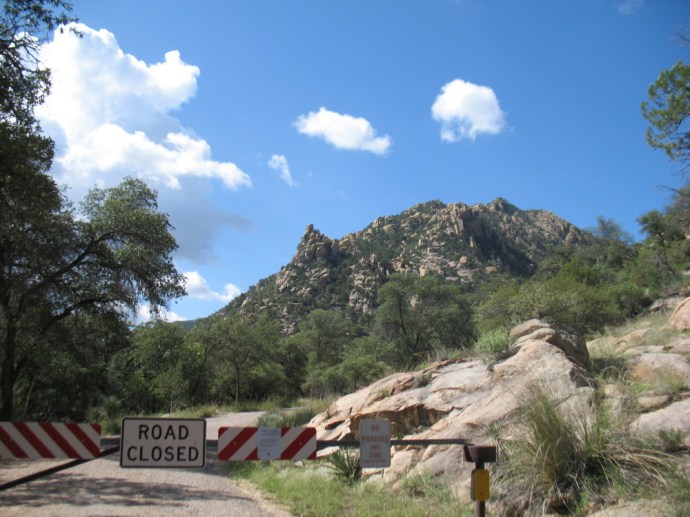 The now paved road becomes a curbed road meandering through a scrub oak forest with asphalt parking areas. There are signs for a nature trail, signs for each plant, species, and big signs about the history of Cochise. There is a horse trail, and an historic trail of signs. All of these and we can’t find the stronghold hiking trail sign.