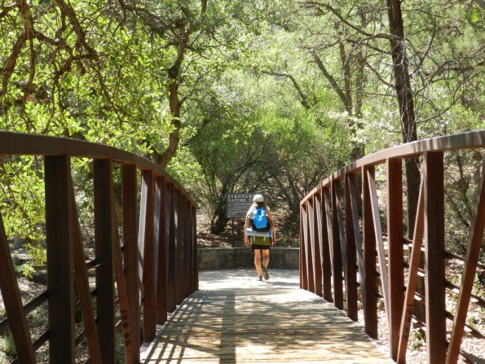 The creek is dry today, but shows signs that water does flow through here with rains. All along it there are trees to shade us.