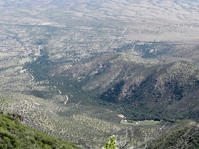 Far down below, we see the old orchard that DF used to live in at the base of Miller Canyon. When she was a younger woman just fresh from the east, she would hike up to Miller Peak to visit with her husband, who manned the fire watchtower. She thought nothing of climbing the rugged trail under the light of a full moon. She had no sense of danger, nor distance.