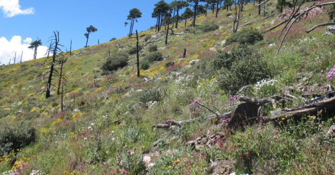 The local rock features dissipate, but now there is a steep meadow of astounding color as far as we can see. The flowers have taken over, “Wow!!!”