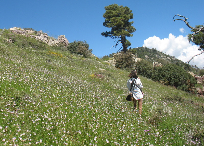 Everywhere masses of flowers, bushes to our waist are thick with flowers. Flowers sweep our legs, soft flowers, and flowers on stiff sticks, flowers made to bend in the wind and now bend in our passing, flowers in every pastel color and shape defined by grace.