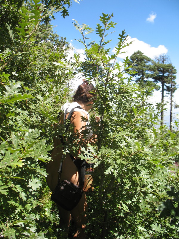 The thin trail is buried under the thick foliage. As we pass through short beginnings of taller trees, their stalks at the edge of the trail, it is evident that this is the trail less traveled.