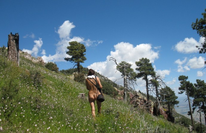 I stretch and make my way to the edge of the trail to get some grapes out of my pack and dispose of the messy papers. Occupied, I notice out the corner of my eye maybe 30 feet away, another hiker. She has turned around, and vacillates where her next step is. She doesn’t know how to approach naked people. For all she knows, she maybe intruding on a private moment, and embarrass me. When I see this, I call to her, “It’s okay, We’re not concerned, if you aren’t.” I make a show of business as usual and casually head back to the stone platform, my back to her. She comes forward. I add assurances, “We’re just naked hikers.”