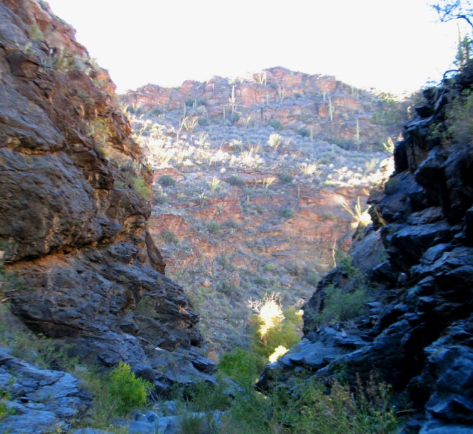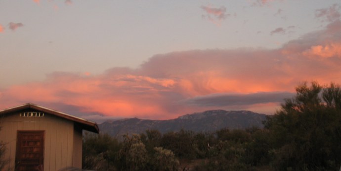 I make my pursuit into the desert, stopping to enjoy the vistas. To the east, the clouds are risen, separated from the Catalina Mountains, which have turned a deep burgundy in the sun’s setting. The sliver of rainbow still gives hope.