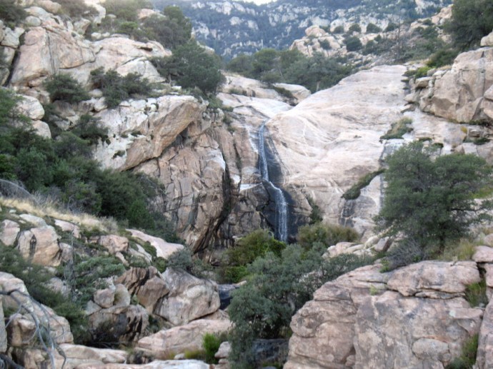 I heard the rumble. The lightning must be around. Those dark grey skies may be seen outside the window to the east, but to be sure, naked and barefoot, I make my way outside and up the granite slope to observe. There is rain between the grand Catalina Mountains and me, and a sliver of a rainbow to the southeast.
