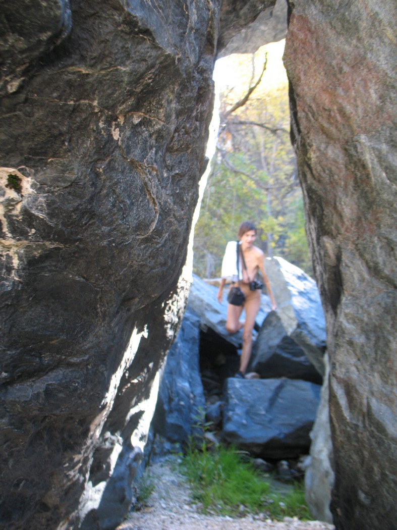 He tells us that further, where “the really good stuff” is, it is much rougher and more dangerous climbing. Perhaps, on another day. We will relax here for a while, eat, enjoy the cool black stone on our bare bodies.