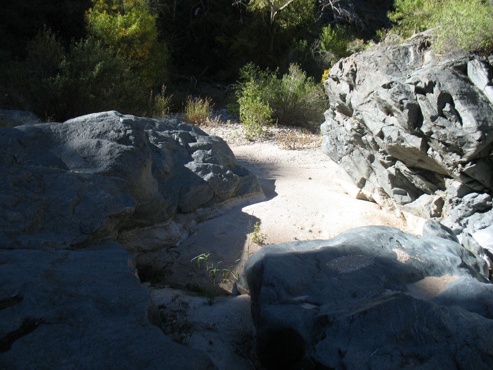 We eventually arrive at a wobbly bluish black slab of hard stone. It is all shaded and its shape flows like water.