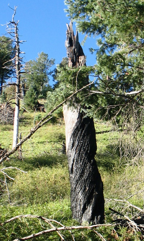 After my climb out of the tent, I stand stiffly and take in the wilderness. These trees all tell a story; it is their history they speak of. It is like a mother’s stretchmarks or an old soldier’s wounds. These are tangled, bent, burled and shaped by their lives. The rings have a tale, too. There is an old hulk with a twisted trunk near the watercourse. The twist says that it had had a ley energy shape it. When the fires came, they burnt it to be like a barber pole.