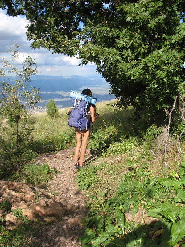We are going uphill. I remembered the trail being more level than it is. We come to the ridge where the trail defuses, disappearing. An older couple comes up the other way. I drop my shirt out of my waist band as DF does the same. They have been day hiking, preparing for an even more challenging hike. I notice their long legs. They tell of where they have been today, and I wonder how they could cover so much ground.
