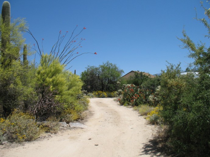 As we caught up, he began to show me around his property. I realized that I had never seen the acreage. Upon my request, he took me on a full tour of his desert twenty, or so, acres. The main wash rolls through the property on the hidden side of the hills, which you don’t see from the south face, where he lives. It is covered with the usual mesquite and grasses. It is the stealth route that DF and I have used to access a tall waterfall through the Stone Canyon Golf Course and residential area. The gated community sprung up blocking my old bike path to the waterfall, but that is another story.