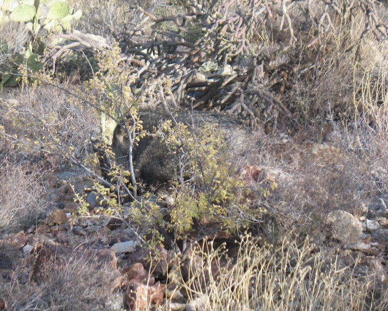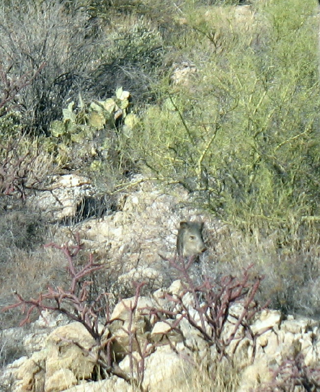 The trail circles around and across the other side of this ridge. I realize that I’m circling the alerted critter, heading him off. Impolitely, I continue. I have camera ready and below, I am seeing seven to nine javalina fanning out in every direction, but mine. All are in alarm. They scurry through the thick brush 30 to 40 feet generally and stop in hiding.