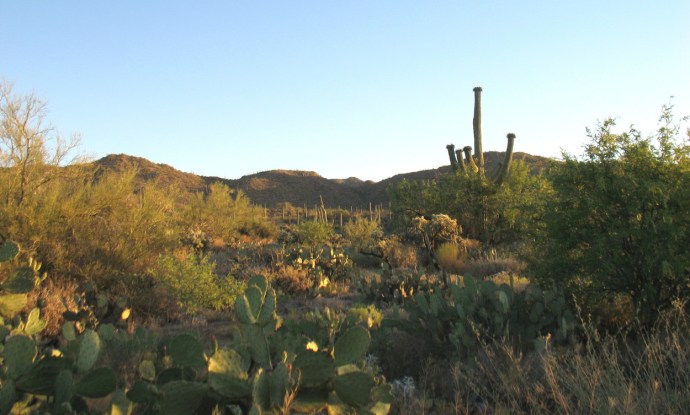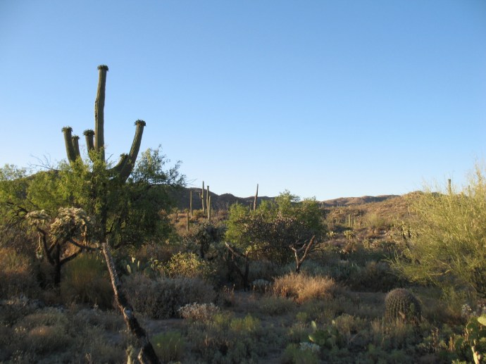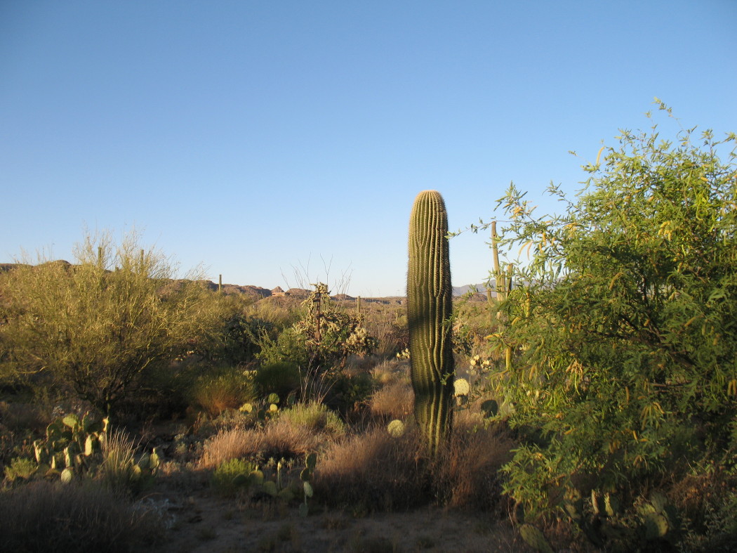 This calm mind relaxes and just takes existence in. For example, the saguaro isn’t so much a saguaro, or green, no label, just what it is, an object in the proximity of eyesight. The other plants are perceived the same. There is awareness, but for the most part just a sensation. There is no conception of a thing called a body, but only what it is at the moment, another part of the oneness of it all.