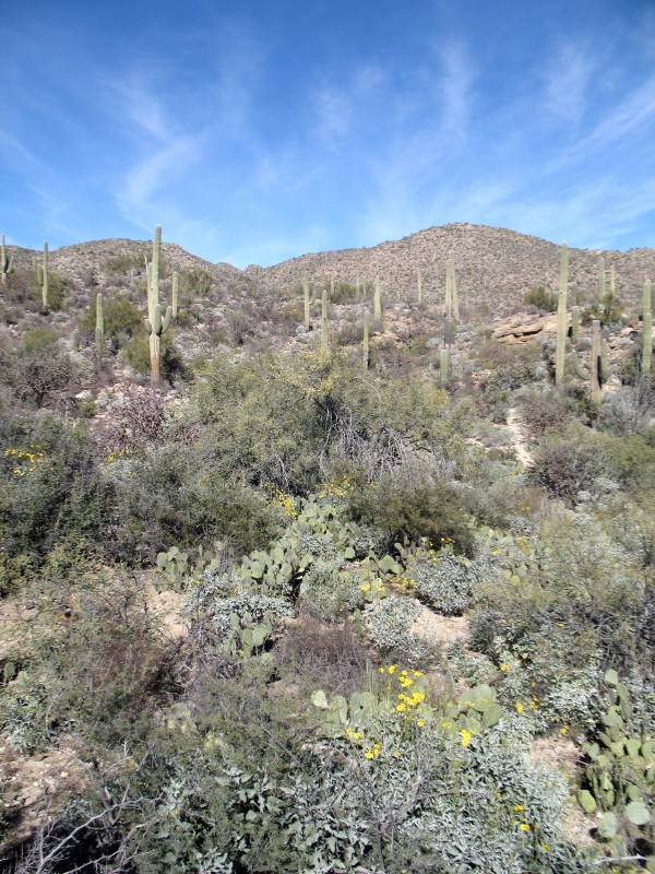 We have had the intention of staying at the Hot Springs for four naked days with a Friday trip out to Bonita Creek for a hike and exploration of that canyon. The weather has turned cold and sustaining northeasterly winds have tortured us. Our hike has now been changed to Sunday afternoon, when the temperature is forecast to rise above 70F and the winds will drop from 20mph plus to 9 to 13mph. I have hope that the narrow canyon with sharp steep walls will have the winds caught in tree tops, if it doesn’t just swish over it.