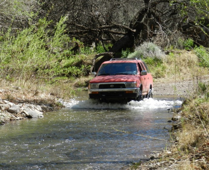 Running up the water course, around the bend, comes a newer Toyota 4-runner. The driver pulls up. It is a young woman maybe 19 years old. She has just driven up with no problem.